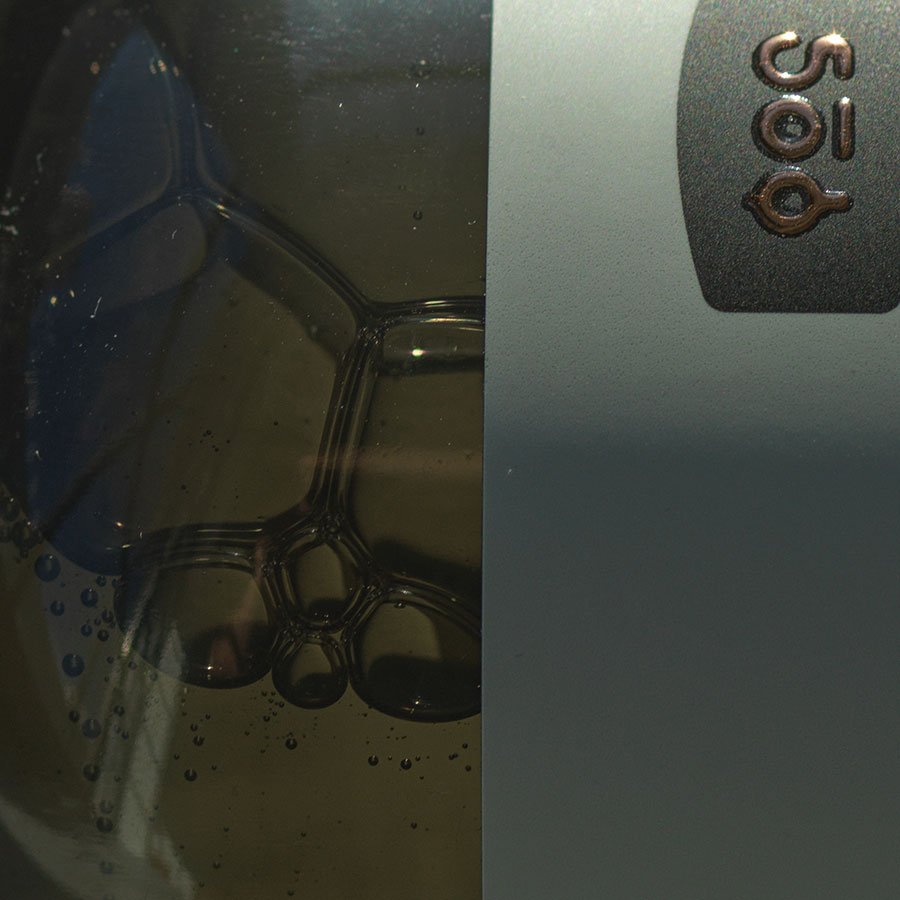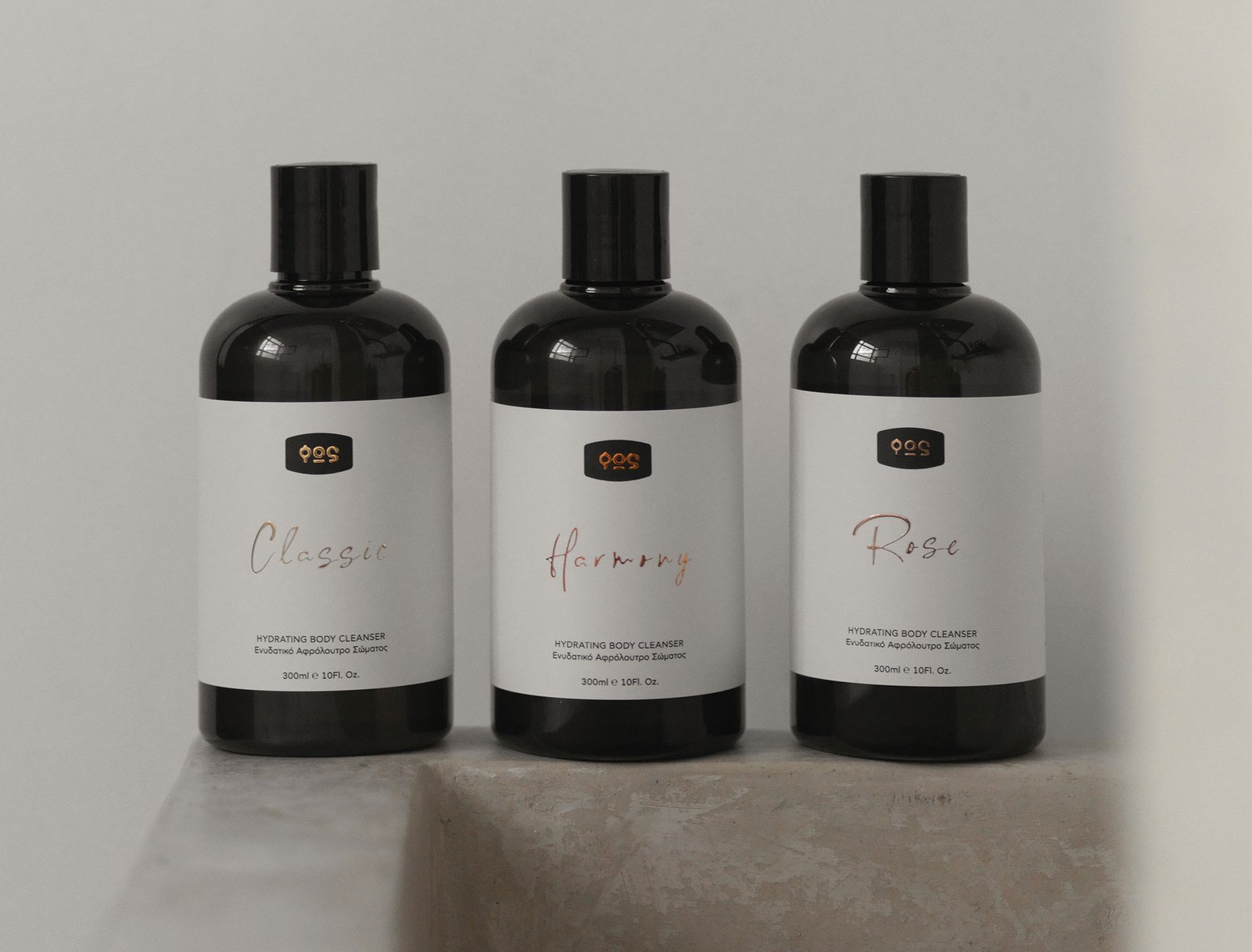 Το μπουκάλι στο οποίο συσκευάστηκαν ήταν μαύρο ημιδιαφανές, οπότε η ετικέτα επιλέχθηκε να είναι λευκό για να δημιουργεί έντονη αντίθεση. Το λογότυπο τοποθετήθηκε ψηλά στο κέντρο και ακριβώς από κάτω με μία ρομαντική καλλιγραφική γραμματοσειρά, αναφερόταν ο τύπος του υγροσάπουνου.
