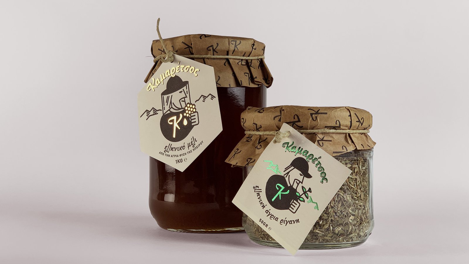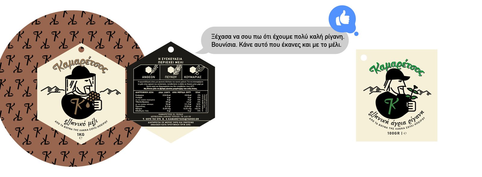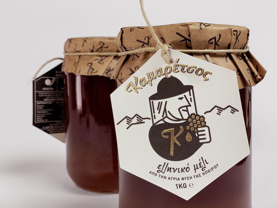 Έτσι, προέκυψε μια συσκευασία που άθελά της δημιούργησε έναν ήρωα που ανταποκρίνεται και  προσαρμόζεται σε κάθε περίπτωση στις ανάγκες της εποχής. Ο Καμαρέτσος, αυτή η ευγενής, καλοσυνάτη φιγούρα που κρύβεται πίσω από το μοναδικό αυτό όνομα, πρωταγωνιστεί -στην απλή γραφιστική της εκδοχή- στη σήμανση της μικρής επιχείρησης από τις αρχές της ύπαρξής της. Για τις ανάγκες της νέας δραστηριότητας, ο αγαπητός Καμαρέτσος φόρεσε την ειδική ενδυμασία της συλλογής μελιού και περήφανα δοκιμάζει τα αποτελέσματα της αποκομιδής του. Και φυσικά τι πιο ιδανικό να αποτυπωθούν όλα αυτά σε ένα “κομμάτι” κηρήθρας.